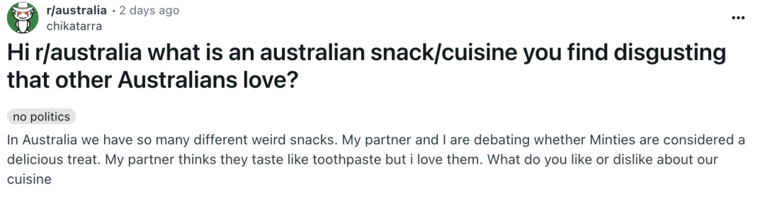 最近一个话题在外网掀起了热议,“有什么澳大利亚小吃让你觉得恶心,而其他澳大利亚人却很喜欢?”