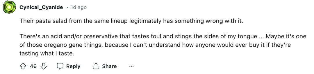 另一位网友@Cynical_Cyanide附和说,“他们同系列的意大利面沙拉确实有问题。”