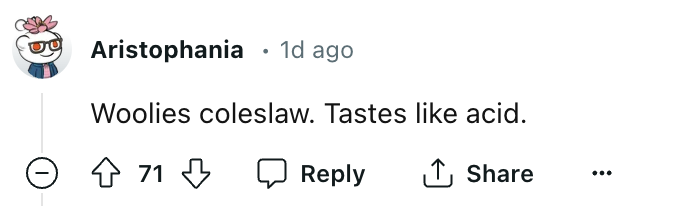 热评第三的食物想必大家都很眼熟,网友@Aristophania评论道,“Woolworths凉拌卷心菜沙拉!味道酸的像喝醋。”