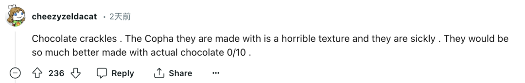 @cheezyzeldacat评论道,“提名Chocolate crackles,用Copha制作的巧克力质地很差,而且味道很恶心,用真正的巧克力做出来会好得多。”
