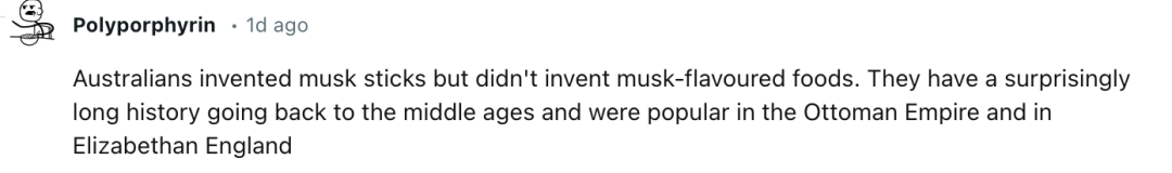 @Polyporphyrin补充道,“澳大利亚人发明了麝香棒,但没有发明其他麝香味食品。”