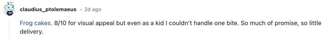 网友@claudius_ptolemaeus评论道,“那一定有青蛙蛋糕, 视觉冲击力太强,就算我是个孩子,我也一口都吃不下,属于形式大于内容。”