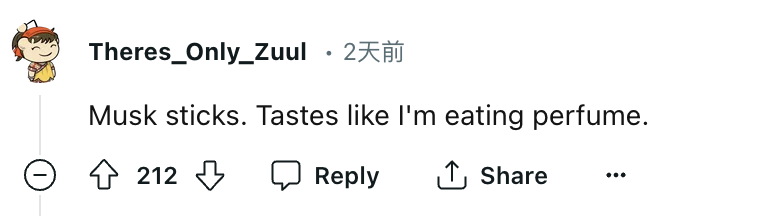 @Theres_Only_Zuul说到,“麝香棒!味道就像我在吃香水。”