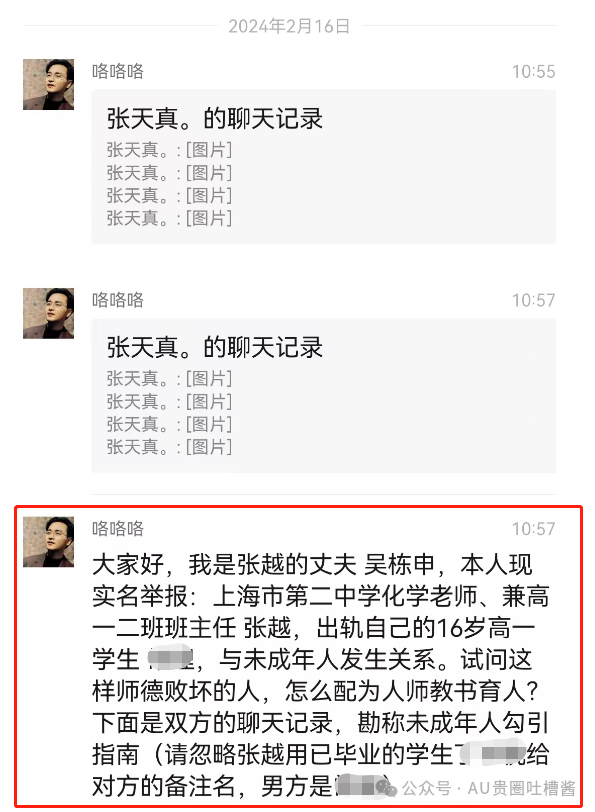 近日,一则自称张越的丈夫吴某实名举报,上海市第二中学化学老师、兼高一二班班主任张越,出轨自己的16岁高一学生常理,与未成年人发生关系消息,引发关注。