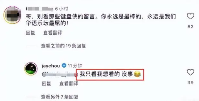 从而,霉霉的粉丝和周杰伦的粉丝开始互撕,阵地从ins到微博再到小红书!面对这些评论,18日,周杰伦在一位粉丝的留言下回复称,“我只看我想看的,没事”。