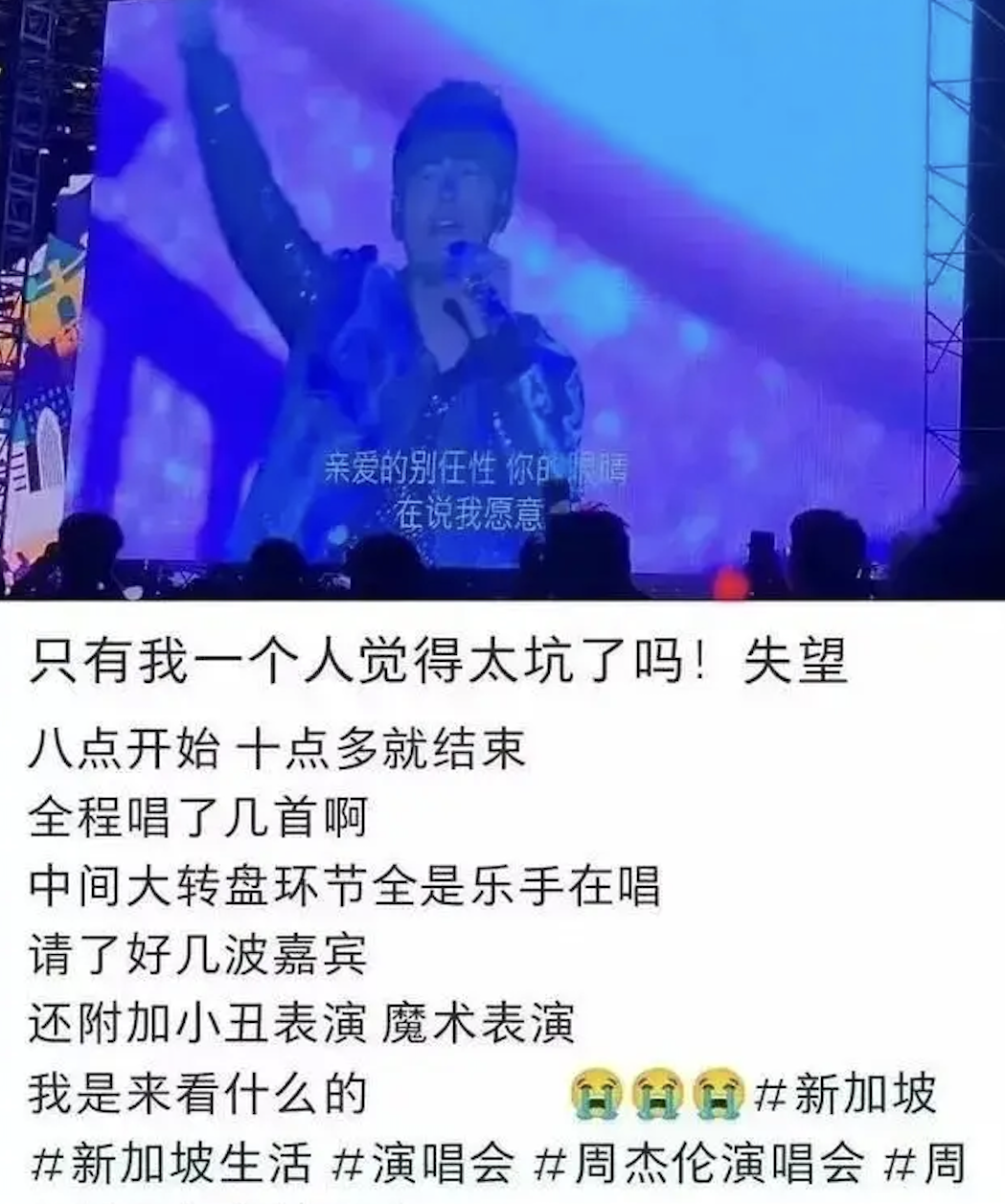 新加坡演唱会那敷衍的程度,连当地媒体都报道了,甚至演唱会上“免费”发放的荧光棒都是二手掉漆的,而且有的还没电了。
