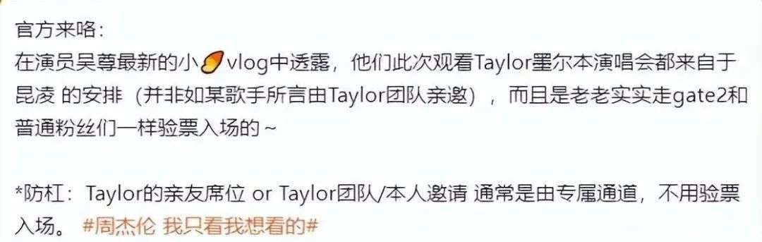 周杰伦说,感谢霉霉留给他这么好位置的票,却被霉霉粉丝扒出周杰伦买的是公关票?并非霉霉邀请的嘉宾,证据就是邀请的嘉宾有包厢,不需要检票。