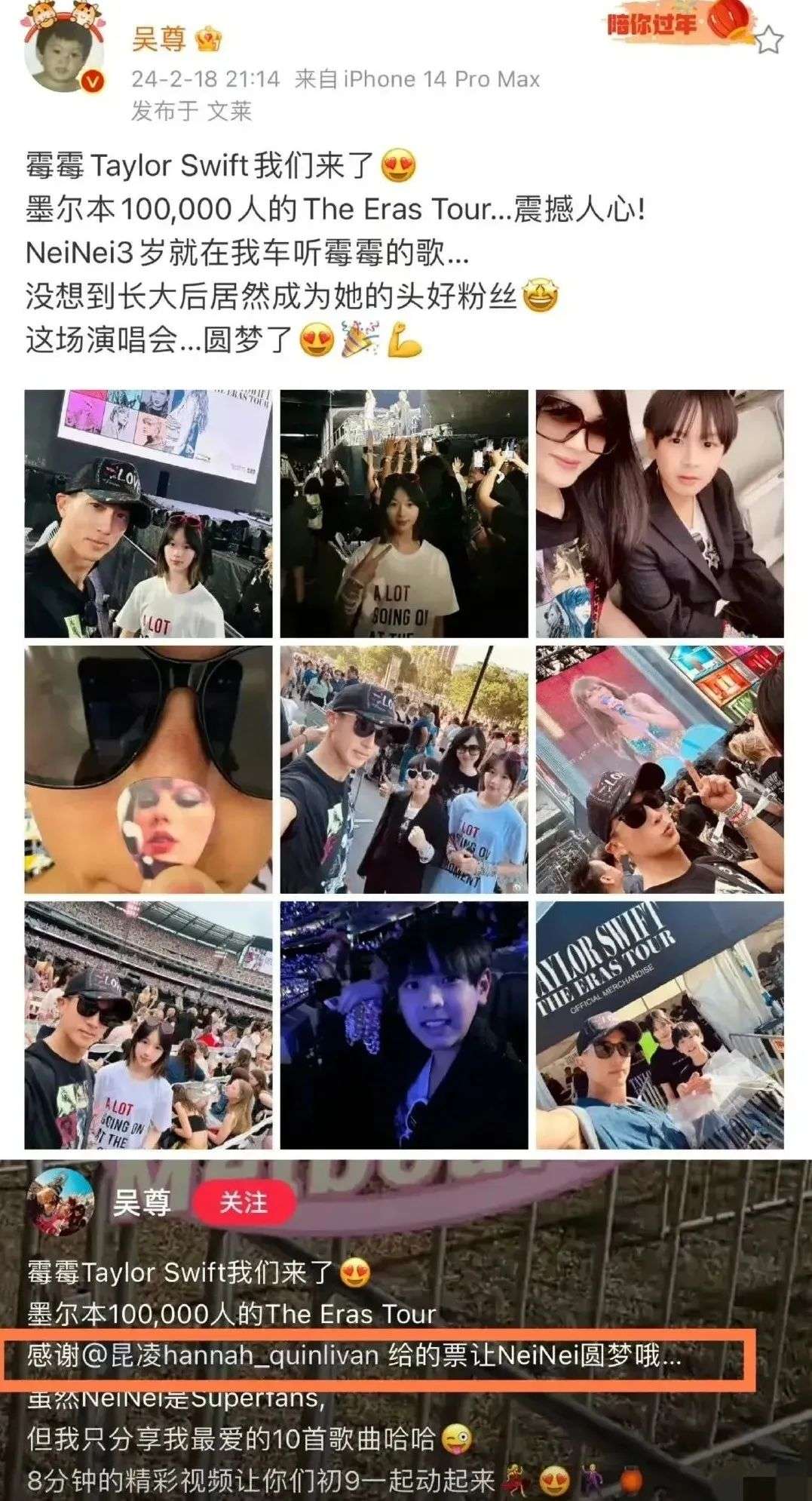 在这个舆论发酵的过程中,吴尊的一条微博动态进一步将事件推向高潮。他表达了对自己能够受邀与家人一起观赏霉霉演唱会的感激之情,引发了网友们的关注!