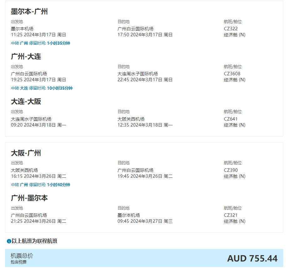 南航大阪赏樱特价机票价格为往返含税755澳币起,还不抓紧拿下!