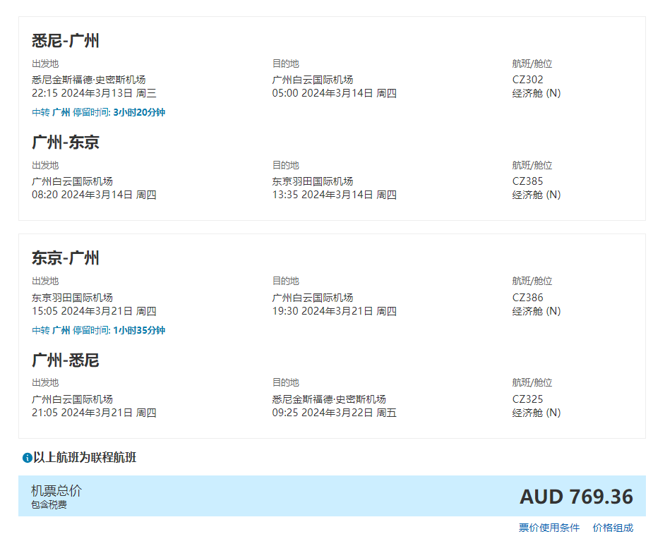 * 樱花季机票可以在南航澳洲官网www.csair/com/au查询和购买;