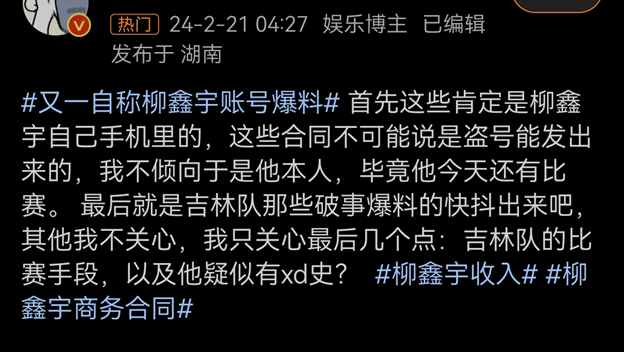 “首先这些肯定是柳鑫宇自己手机里的,这些合同不可能说是盗号能发出来的,我不倾向于是他本人,毕竟他今天还有比赛。”