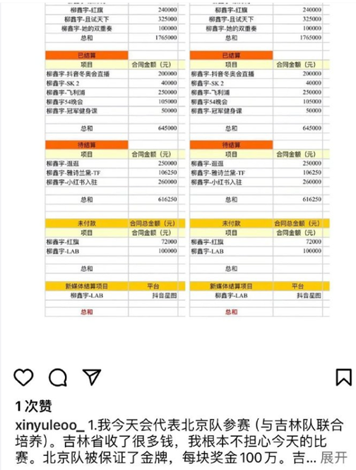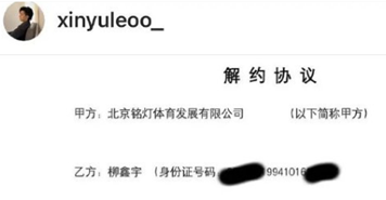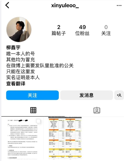 早些时候,又一个自称为柳鑫宇的ins账号爆料,并且贴出了一张协议书、解约协议、一张柳鑫宇商务合作列表合同。简介上写“唯一本人的号,其他均为冒充”,“实名证明是本人。”