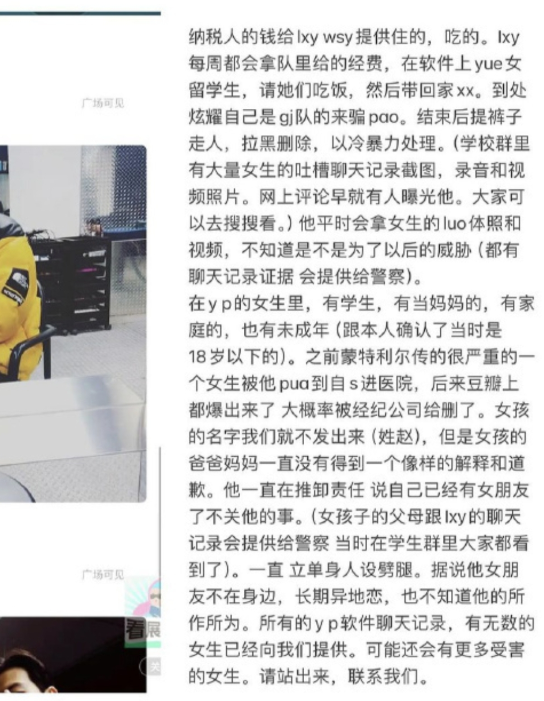 第二,频繁约ii炮!柳鑫宇借用国家队运动员的名头,与加拿大留学的女学生发生关系。完事之后转身离开。当女生纠缠不休时就拉黑;