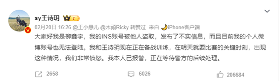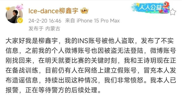 当天下午,中国花样滑冰冰上舞蹈运动员柳鑫宇和搭档王诗玥在多个社交媒体平台发布声明称:“柳鑫宇国外社交媒体被恶意盗号,发布内容均不是本人发布,现已报警处理。”