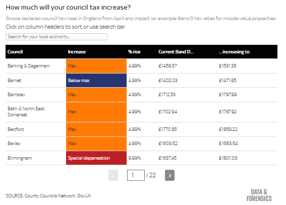 在已公布计划的129个市政局(共137个)中,只有8个低于4.99&。升幅最低的是哈特尔普尔(Hartlepool)为2.99%,罗瑟勒姆(Rotherham)为3.5%。