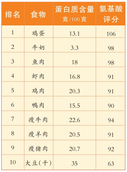 中国营养学会曾对常见食物进行了营养评价,选出了排在前十名的“优质蛋白质十佳食物”(详见表格)。