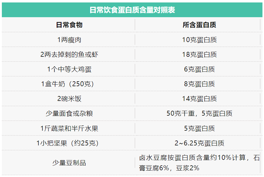 一般来说,每日吃适量主食(男性6两以上,女性5两以上),1~2袋鲜牛奶或等量的酸奶,1个鸡蛋,40~75克畜禽肉类、40~75克水产品、25~35克大豆和坚果类,就足以补充健康人每日所需蛋白质。