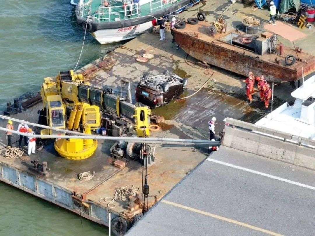 2024年2月22日,广州南沙,下午3时30分左右,落水小车被打捞起来。(南方周末记者 翁洹 / 图)