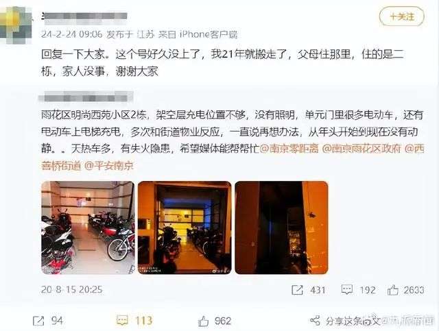 并在2021年6月再次发文称:“物业不作为,多次反馈依旧有人推电动车上楼,隐患很大,多次反馈街道物业无果。”