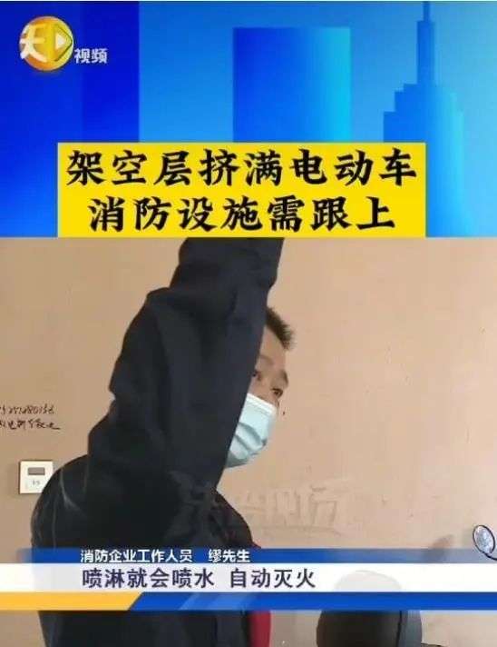 当时小区物业表示,原先架空层的设计并非用于停放电动车,所以并没有烟感喷淋设施,随着架空层改变用途,已经请了专业人士查看能否增设消防设施。