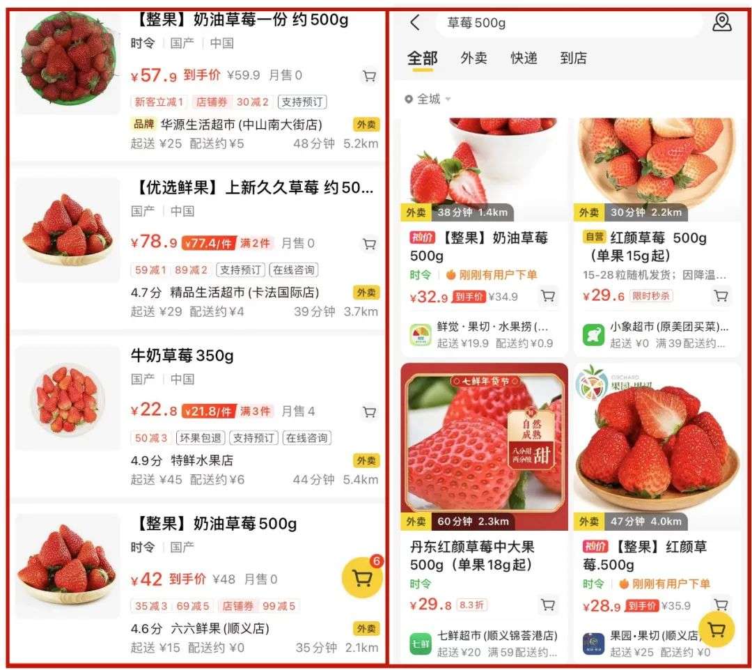 记者先后走访了BHG生活超市、永辉超市等多家商超发现,丹东、佳沃、红颜等品种的草莓散发着阵阵清香,有的按盒出售、有的按斤售卖,价格与去年11月调查时相比都出现了不同程度的下跌。其中鑫海韵通大卖场石园店的草莓价格由此前58元/斤降至24元/斤,BHG生活超市的草莓价格由此前59.8元/斤降至33.8元/斤,永辉超市(新世界店)同款草莓价格由此前69.8元/盒降至39.8元/盒。随后,记者通过美团APP查询发现,此前价格在40-80元/斤的草莓,线上售价也跌至了30元左右/斤。