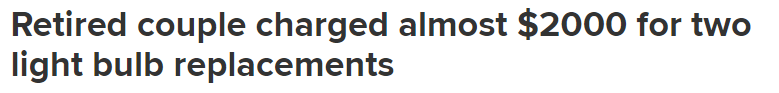 一对居住在布里斯班南部的退休夫妇Maurie Smith和Colleen Smith称,他们在布里斯班南部的家中更换两个灯泡,却被一家电力公司收取了近2000澳元的费用!