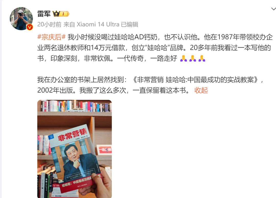 我小时候没喝过娃哈哈AD钙奶,也不认识他。他在1987年带领校办企业两名退休教师和14万元借款,创立“娃哈哈”品牌。20多年前我看过一本写他的书,印象深刻,非常钦佩。一代传奇,一路走好。