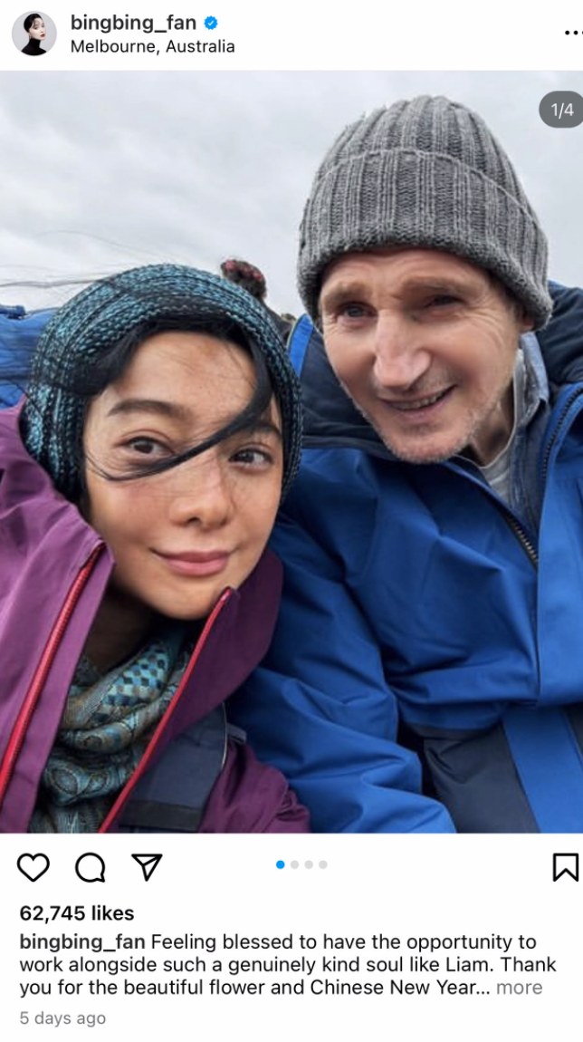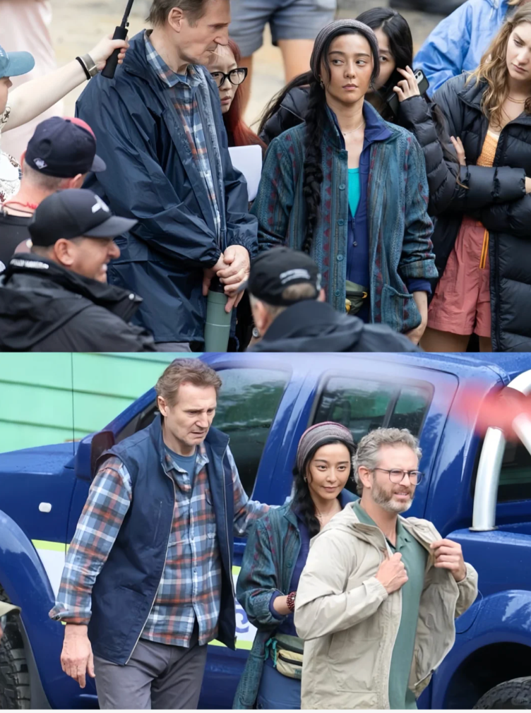 范冰冰分享的照片中包括了与Liam Neeson的合影,展现了剧组之间的友好氛围;