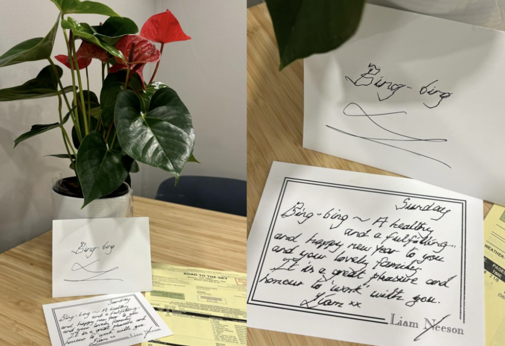 在贴文中,她感慨与Liam Neeson等人一同工作的幸运,并感谢他们送来的美丽鲜花和新年祝福。