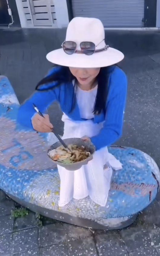 可以看到,视频中她穿着蓝色外套,里面配了白色长裙,戴了一顶遮阳帽和墨镜,蹲在路边吃炸酱面。