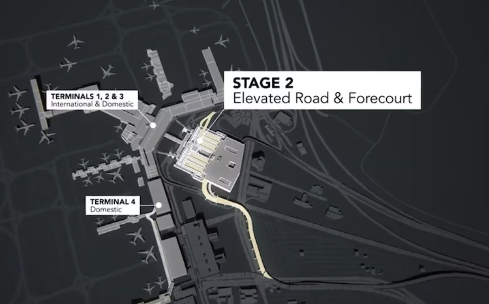 一旦新道路于 2026 年竣工,只有 Skybus、出租车和拼车乘客可以使用航站楼和多层停车场之间的现有下客区。