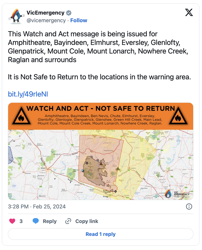 专家提醒居民保持警惕,做好疏散准备。紧急服务部长Jaclyn Symes对周三的天气表示极度担忧,呼吁民众做好准备应对可能出现的极端火险天气。