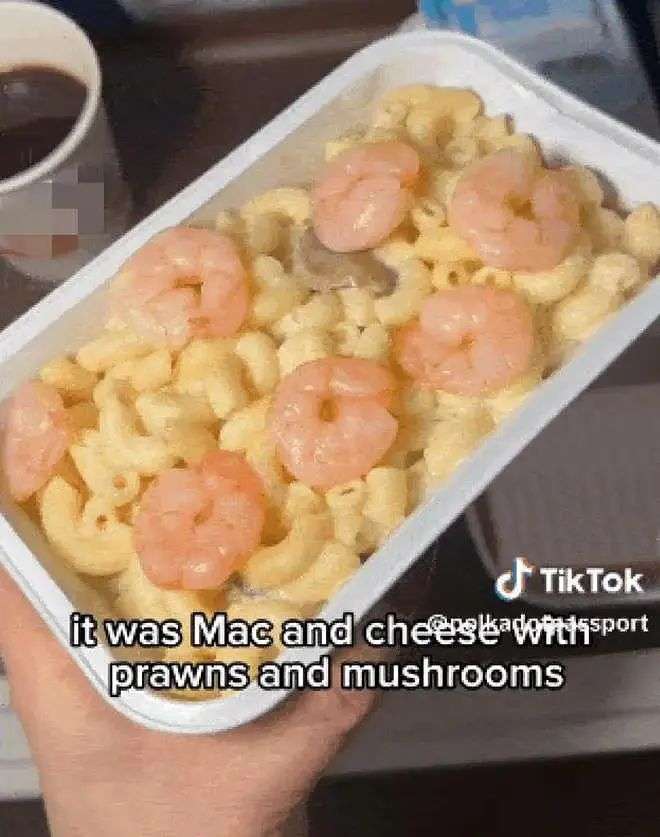 在睡眼朦胧中,空姐给他们送来了“巨大的”大虾芝士通心粉和“黏糊糊的”蘑菇。