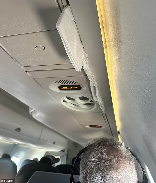 这名乘客还分享了一张照片,显示空调通风口塞着餐巾纸,以防止水滴到乘客身上,窗帘上溅满了食物。