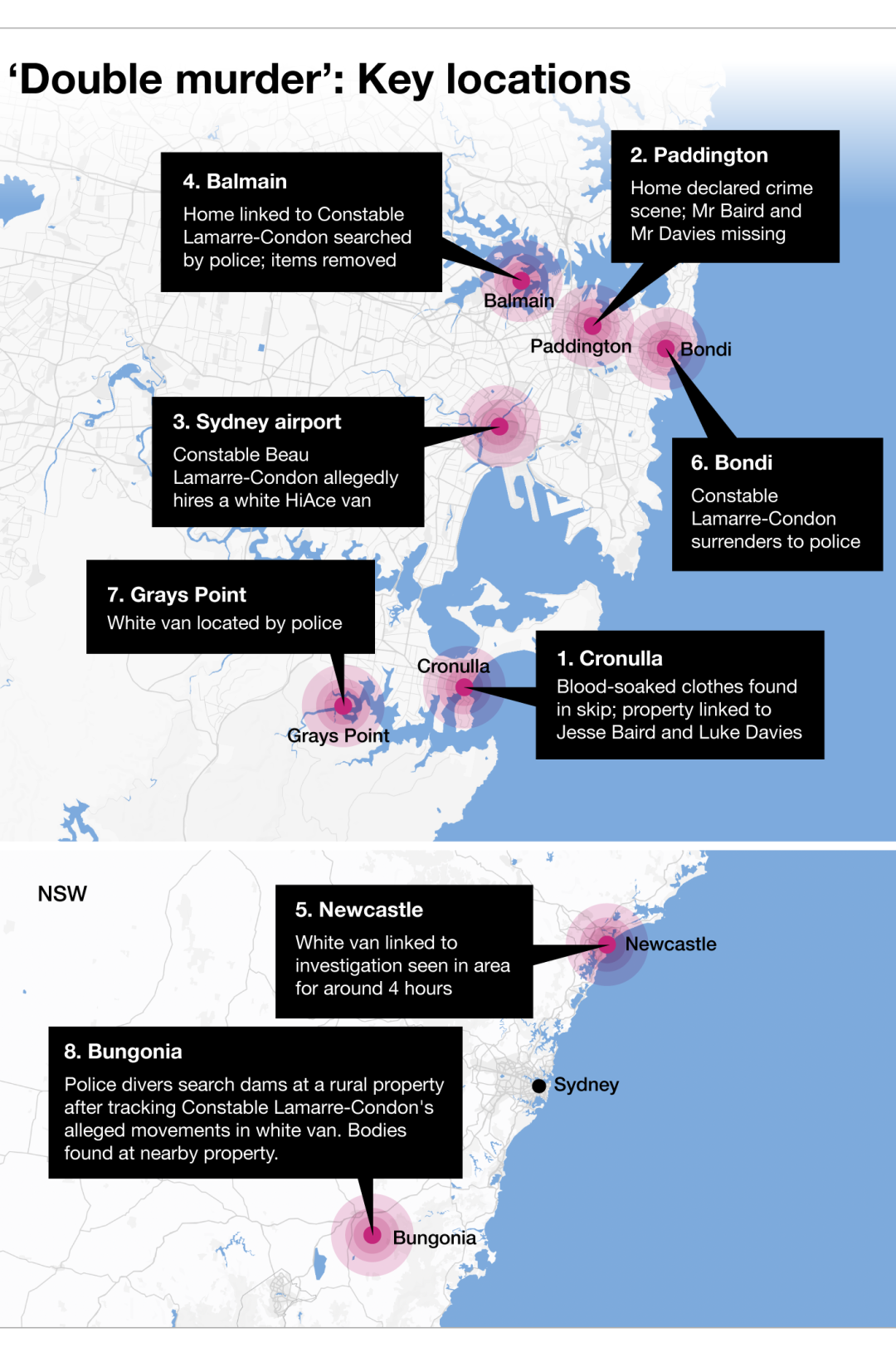 同一天,警方公布了两名被害人失踪的消息,并搜查了Lamarre-Condon位于悉尼Balmain地区的家,扣押了几件物品。