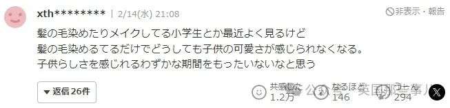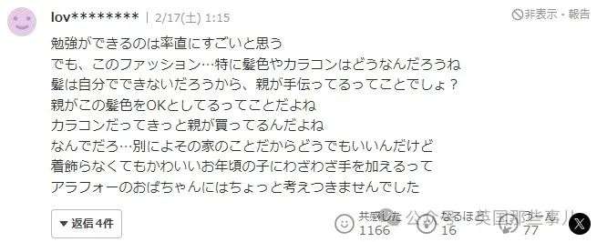 “孩子会学习的确是很厉害。但是这打扮,尤其是发色和美瞳是怎么回事呢。孩子不会自己染发,是父母帮忙的吧?父母觉得这样的发色是OK的吧。美瞳也一定是父母购买的吧。虽然是别人家的事情无所谓,但实在没必要给本来就很可爱的孩子如此打扮。”