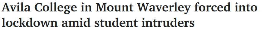 Avila College 面对突发事件,能有条不紊、井然有序地采取相关措施,保证在校人员的安全,真心点个赞!也希望警方加紧调查 Balwyn 高中的霸凌事件,给受影响学生一个公正的交代。