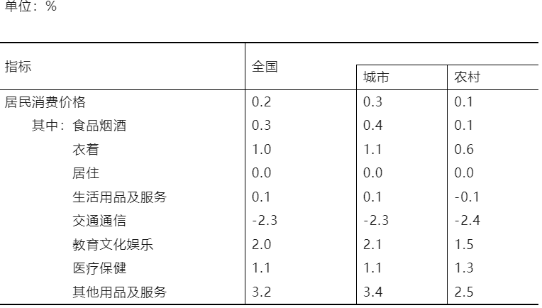 全年居民消费价格比上年上涨0.2%。工业生产者出厂价格下降3.0%。工业生产者购进价格下降3.6%。农产品生产者价格下降2.3%。12月份,70个大中城市中,新建商品住宅销售价格同比上涨的城市个数为20个,持平的为2个,下降的为48个;二手住宅销售价格同比上涨的城市个数为1个,下降的为69个。