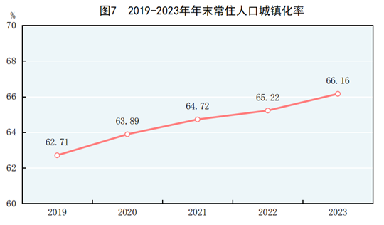 城乡融合和区域协调发展步伐稳健。年末全国常住人口城镇化率为66.16%,比上年末提高0.94个百分点。分区域看,全年东部地区生产总值652084亿元,比上年增长5.4%;中部地区生产总值269898亿元,增长4.9%;西部地区生产总值269325亿元,增长5.5%;东北地区生产总值59624亿元,增长4.8%。全年京津冀地区生产总值104442亿元,比上年增长5.1%;长江经济带地区生产总值584274亿元,增长5.5%;长江三角洲地区生产总值305045亿元,增长5.7%。粤港澳大湾区建设、黄河流域生态保护和高质量发展等区域重大战略深入推进。
