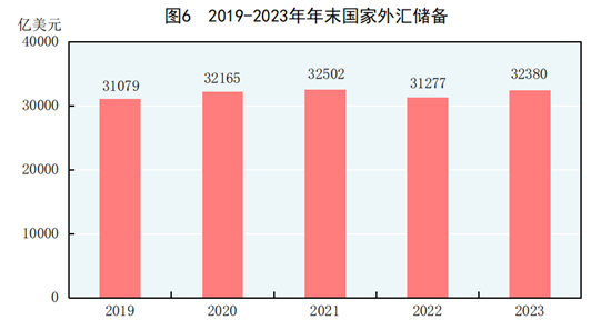 年末国家外汇储备32380亿美元,比上年末增加1103亿美元。全年人民币平均汇率为1美元兑7.0467元人民币,比上年贬值4.5%。