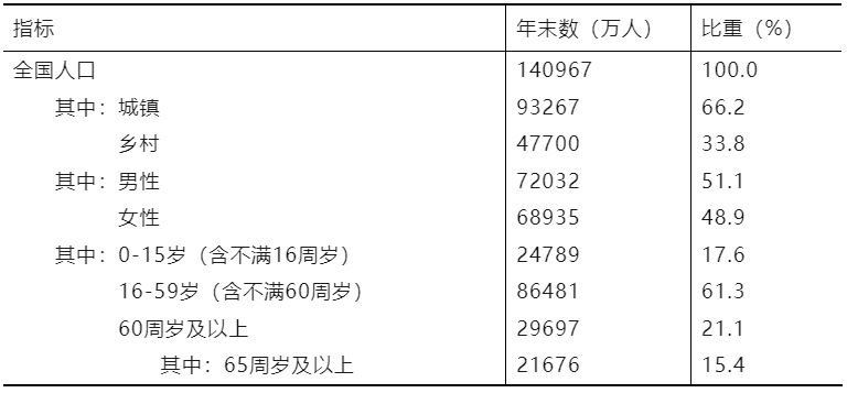 年末全国人口140967万人,比上年末减少208万人,其中城镇常住人口93267万人。全年出生人口902万人,出生率为6.39‰;死亡人口1110万人,死亡率为7.87‰;自然增长率为-1.48‰。
