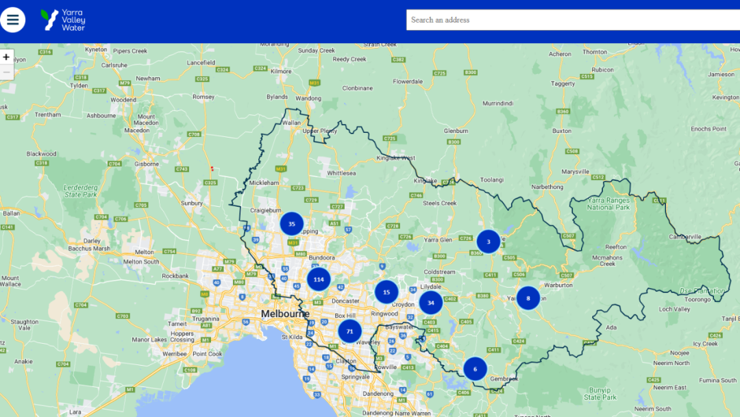 Yarra Valley Water自来水公司服务的区域如下(蓝线圈出的范围以内):