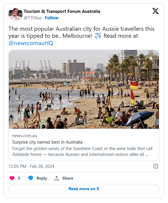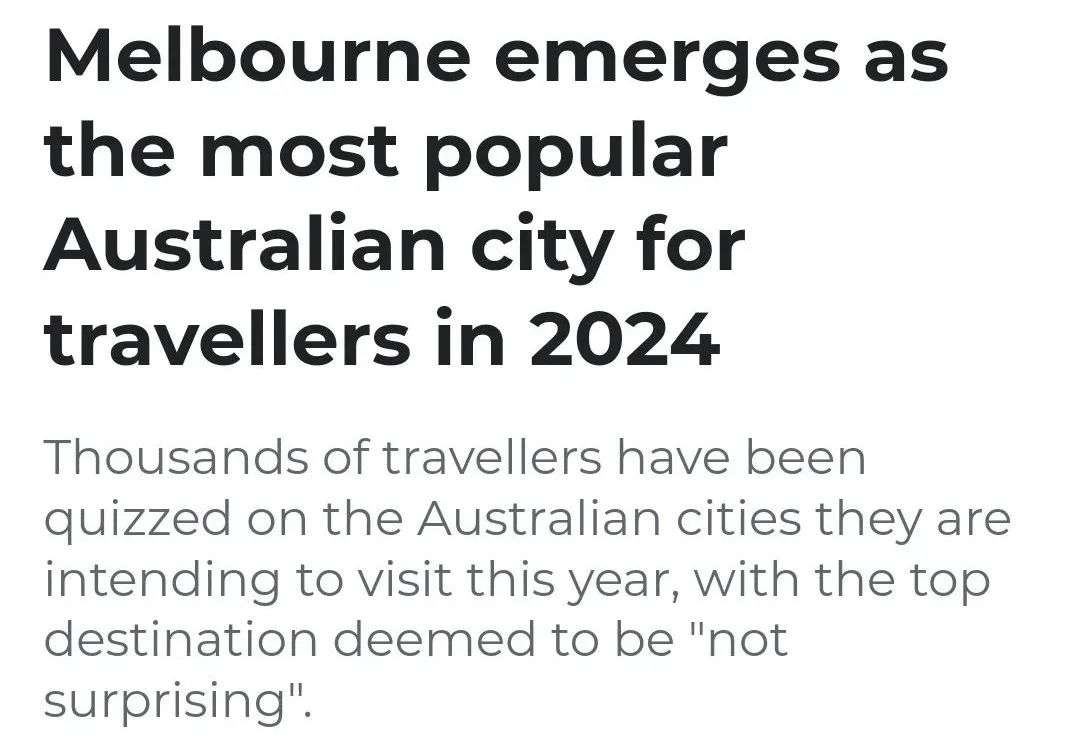 这是权威旅游研究公司“澳大利亚旅游与交通论坛”(TTF)举行的、针对 2000人(年龄从 18 岁至 65 岁人群)的调查,该研究调查了他们打算在 2024 年到访的地方。而结果是,墨尔本遥遥领先,领先于悉尼、珀斯、布里斯班、阿德莱德和霍巴特。