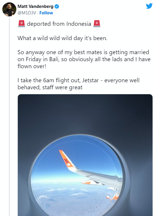 就在周二,一名悉尼旅客Matt Vandenberg乘坐捷星航空飞往巴厘岛。他在推特上详细说明,抵达后,他被印尼海关拒绝入境,并被要求返回悉尼。