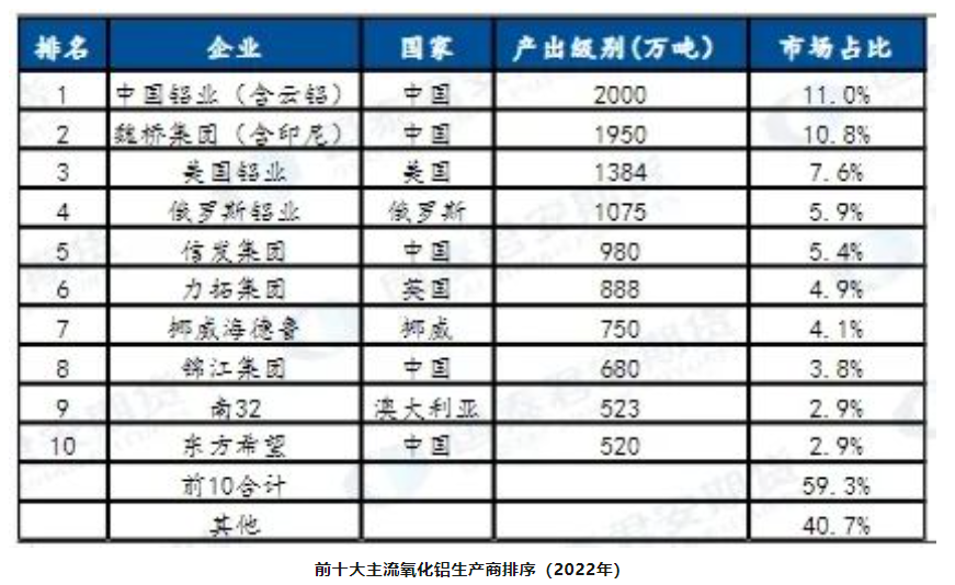 根据阿拉丁的统计数据,2022年全球十大氧化铝生产商(按产量排序)依次为中铝集团(中铝与云铝合并统计)、中国宏桥、美国铝业、信发集团、俄罗斯铝业、三门峡铝业、力拓、海德鲁铝业、S32和国家电投。这些企业的合计产量达到9630万吨,占比约70%,较去年同期下降3%。