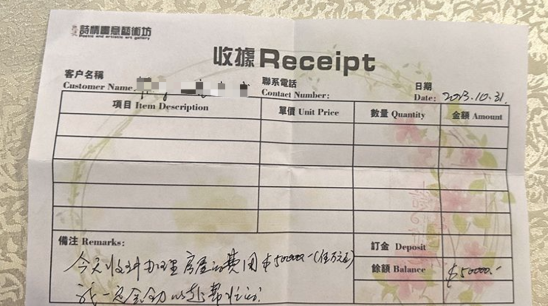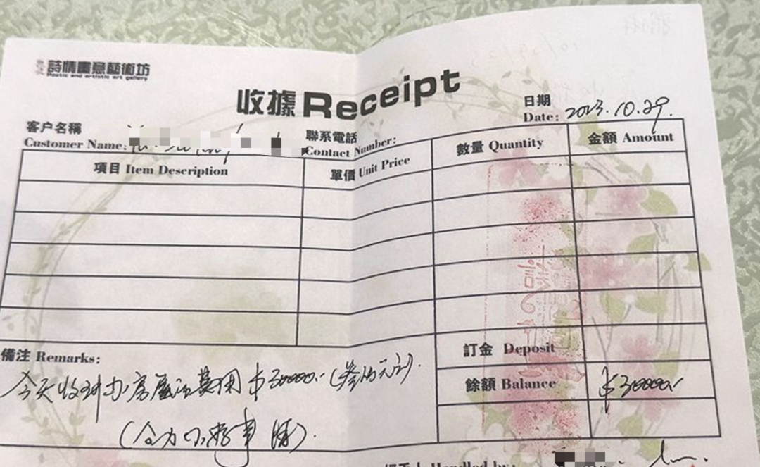 在招待会现场,受害者们纷纷拿出了自己手上的收据,面额从几千美元到几十万美元不等,收据上均写有“诗情画意艺术坊”的名头。