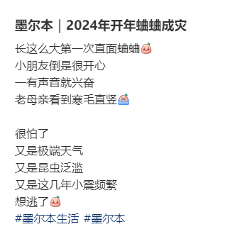 还有华人网友表示,长这么大第一次看到蛐蛐,最开始还挺兴奋,但后来看得多了就害怕了。今年的墨尔本太吓人,又是极端天气又是地震,现在又来昆虫泛滥...