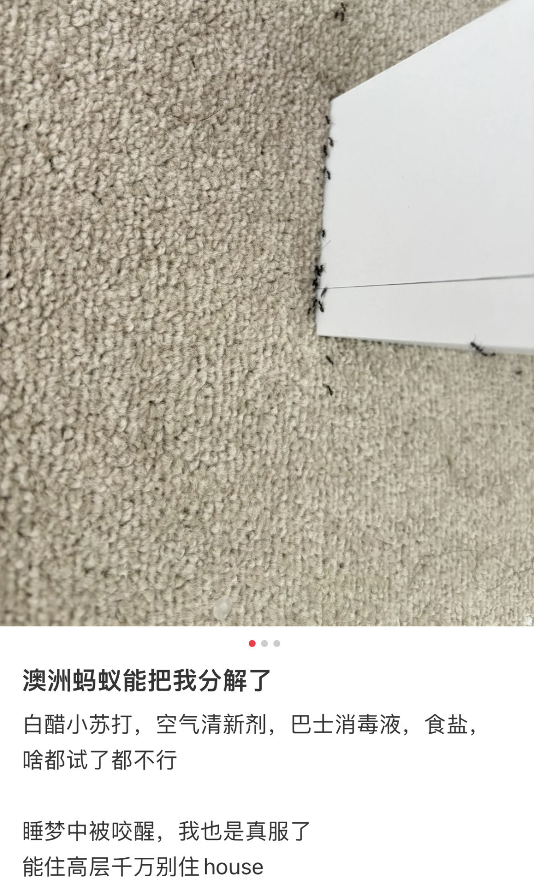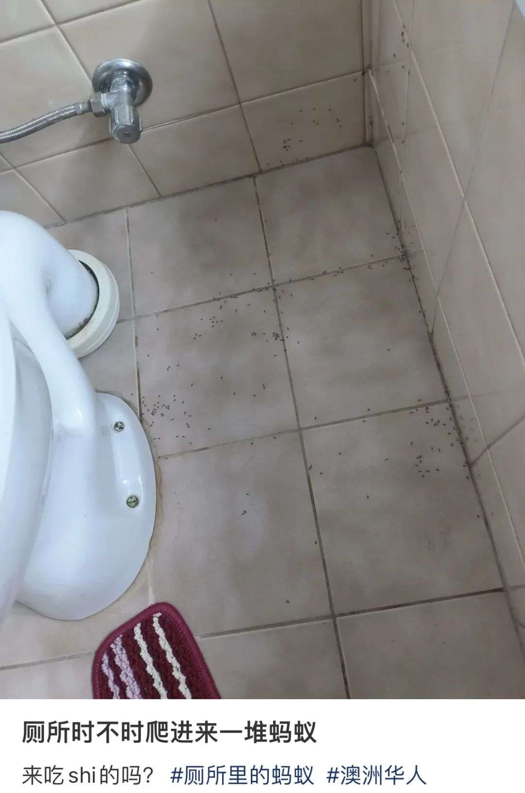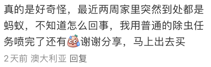 蚂蚁泛滥之后,华人家中也遭殃了,她发帖称,“澳洲蚂蚁能把我分解了!”