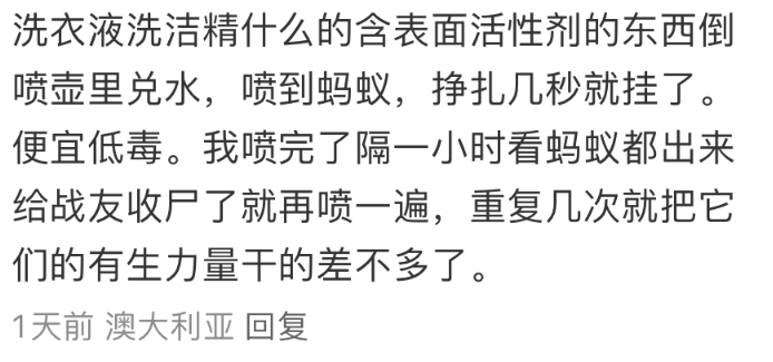 “喷到蚂蚁,挣扎几秒就挂了。便宜低毒。我喷完了隔一小时看蚂蚁都出来给战友收尸了就再喷一遍,重复几次就把它们的有生力量干的差不多了。”