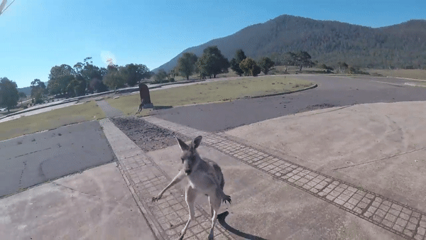 在他的录像里,当一个大袋鼠比他还要早的跳到了他的着陆地点时,他朝着袋鼠说了一句“嘿,有什么事吗,跳跳?”